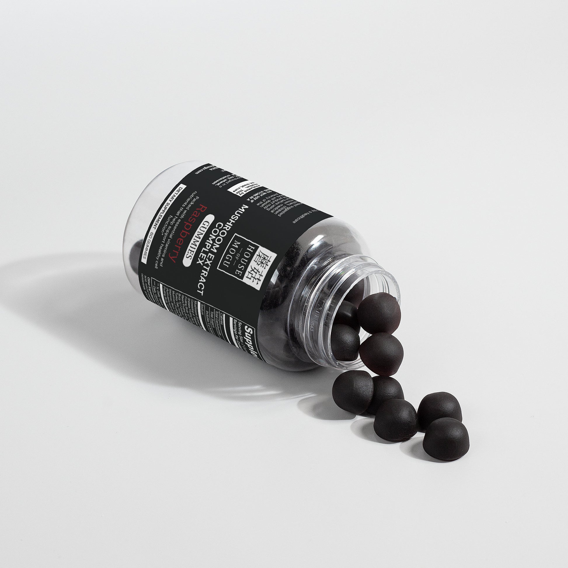 Ingredients: Mushroom extract (Maitake Fruiting Body 10:1 Extract, Shiitake Fruiting Body 10: 1 Extract, Lion’s Mane Fruiting Body 10:1 Extract, Reishi Fruiting Body 10:1 Extract, Cordyceps Fruiting Body 10:1 Extract, Chaga Fruiting Body 10:1 Extract, Turkey Tails Fruiting Body 10:1 Extract, White Button Mushroom Fruiting Body 10:1 Extract, Black Fungus Fruiting Body 10:1 Extract, Royal Sun Mushroom Fruiting Body 10:1 Extract), glucose syrup, sugar, dextrose, pectin, citric acid, natural raspberry flavor, sodium citrate, purple carrot juice concentrate, palm oil (contains carnauba wax).